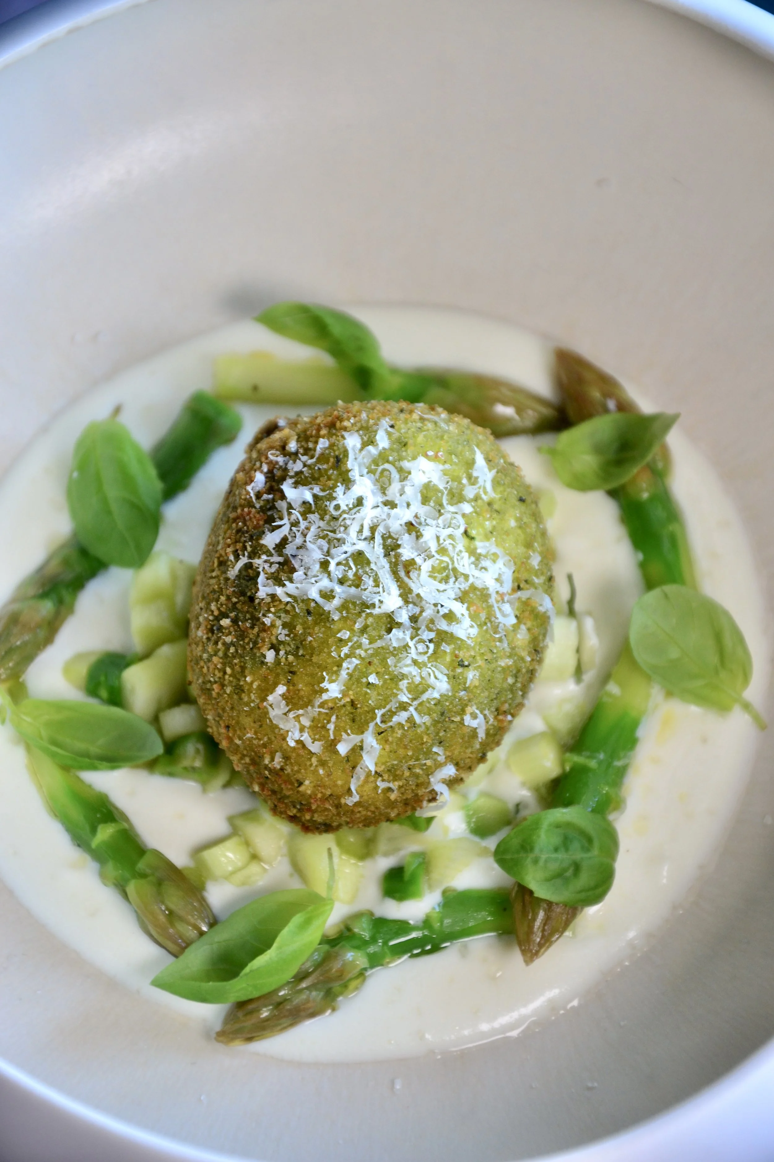 Spread the hot Grana Padano sauce on the bottom of large bowls, add the asparagus creating a sort of a nest and place the crispy egg on top.