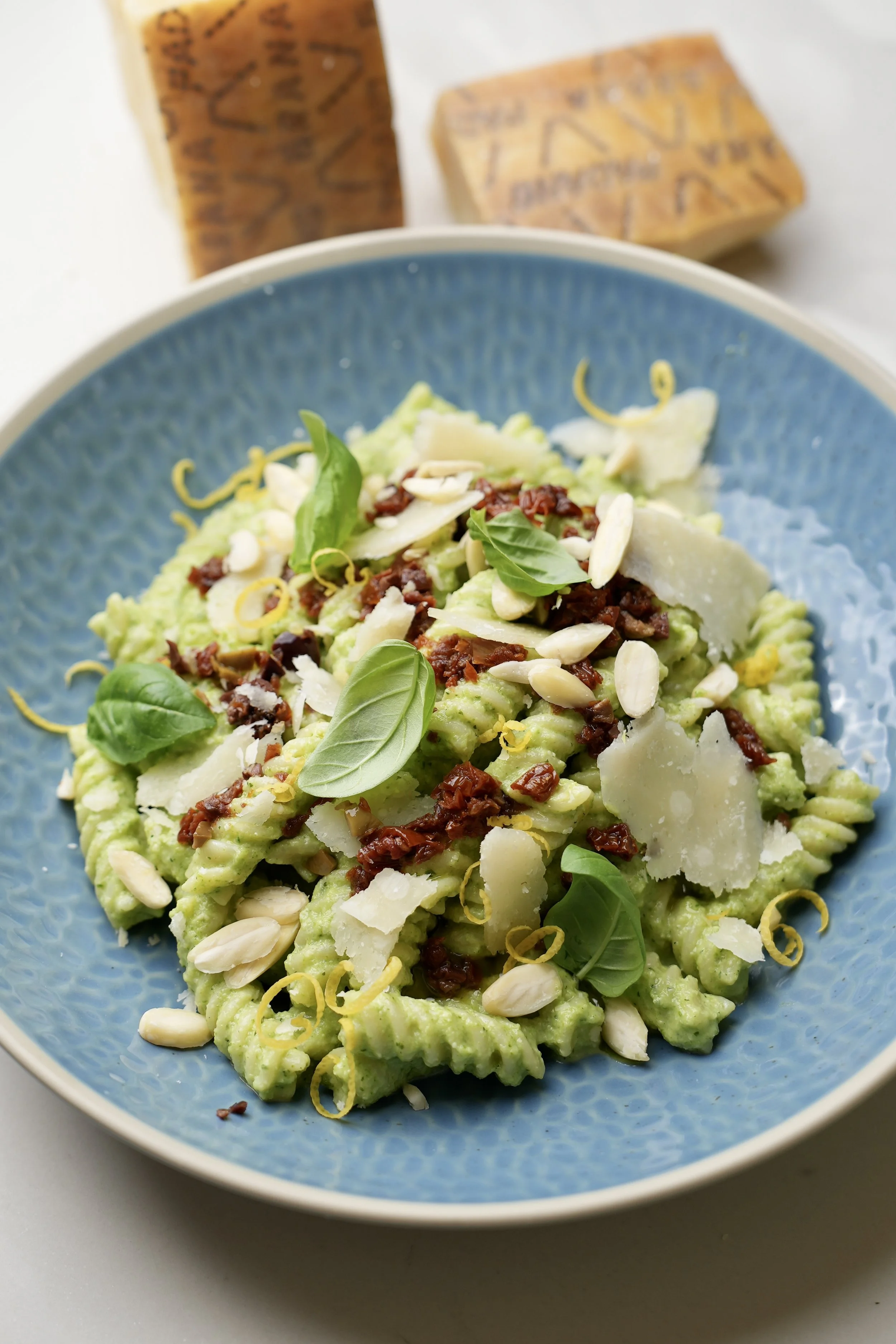 Top the pasta with the chopped tomatoes and olives and a few shaves of Grana Padano. Garnish with basil leaves, lemon zest and a few chopped almonds before you enjoy it.