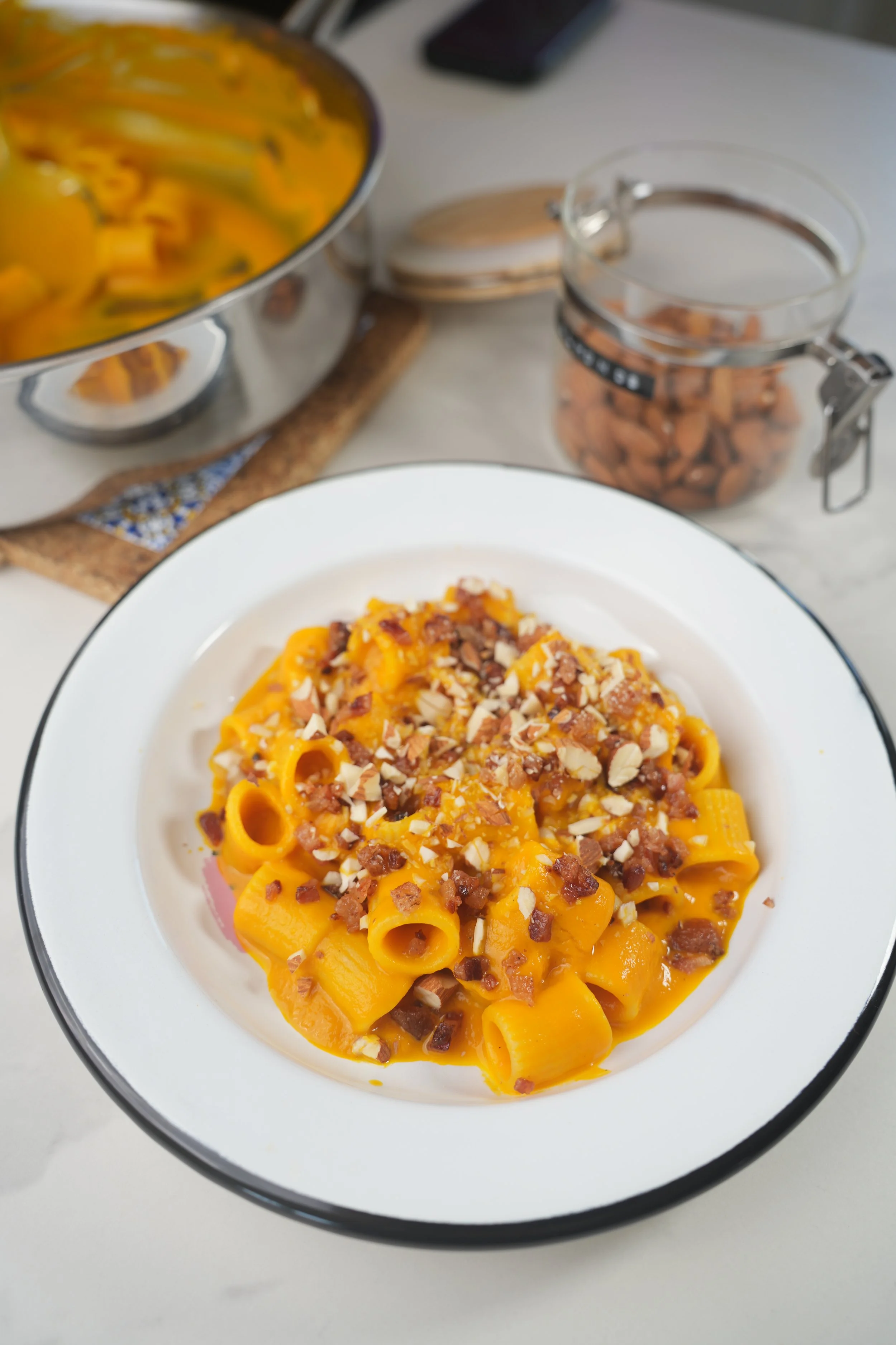 Easy, seasonal and delicious, creamy pumpkin pasta with crispy guanciale and almonds.