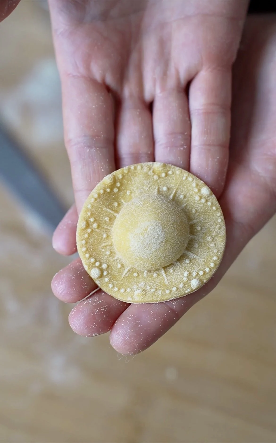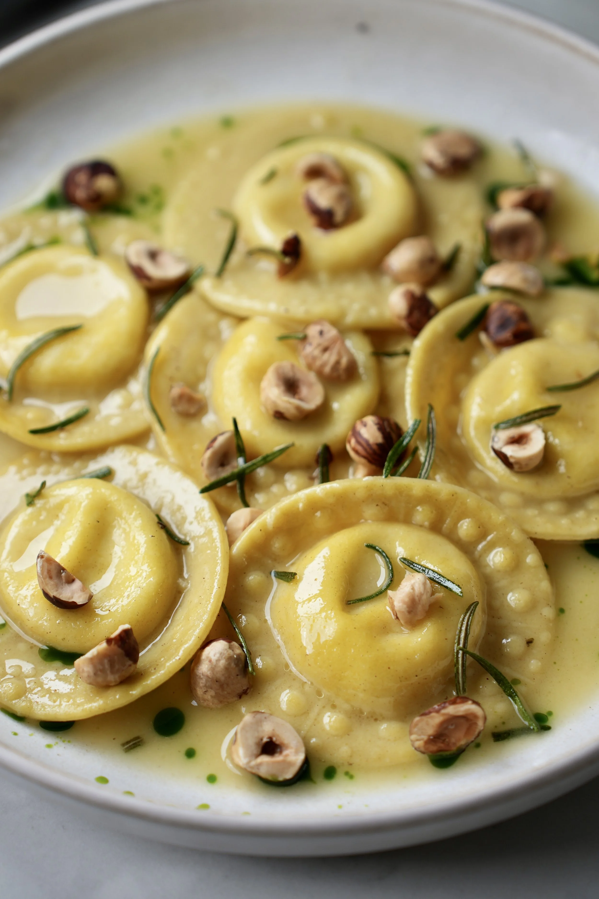 This is a classic Italian winter warmer dish, rich and comforting. The beauty of it is the silky rich filling that hold very well even when hot and that you can fold and seal the ravioli however you like.