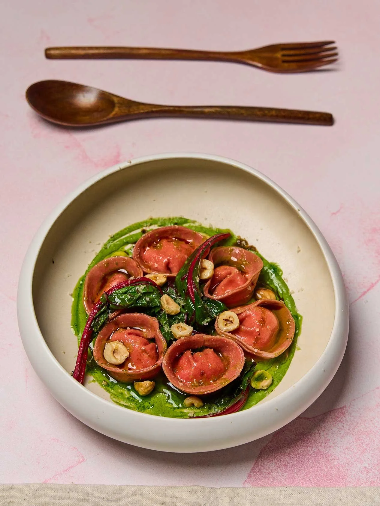 Smoked burrata and beetroot tortelli, chard & hazelnuts