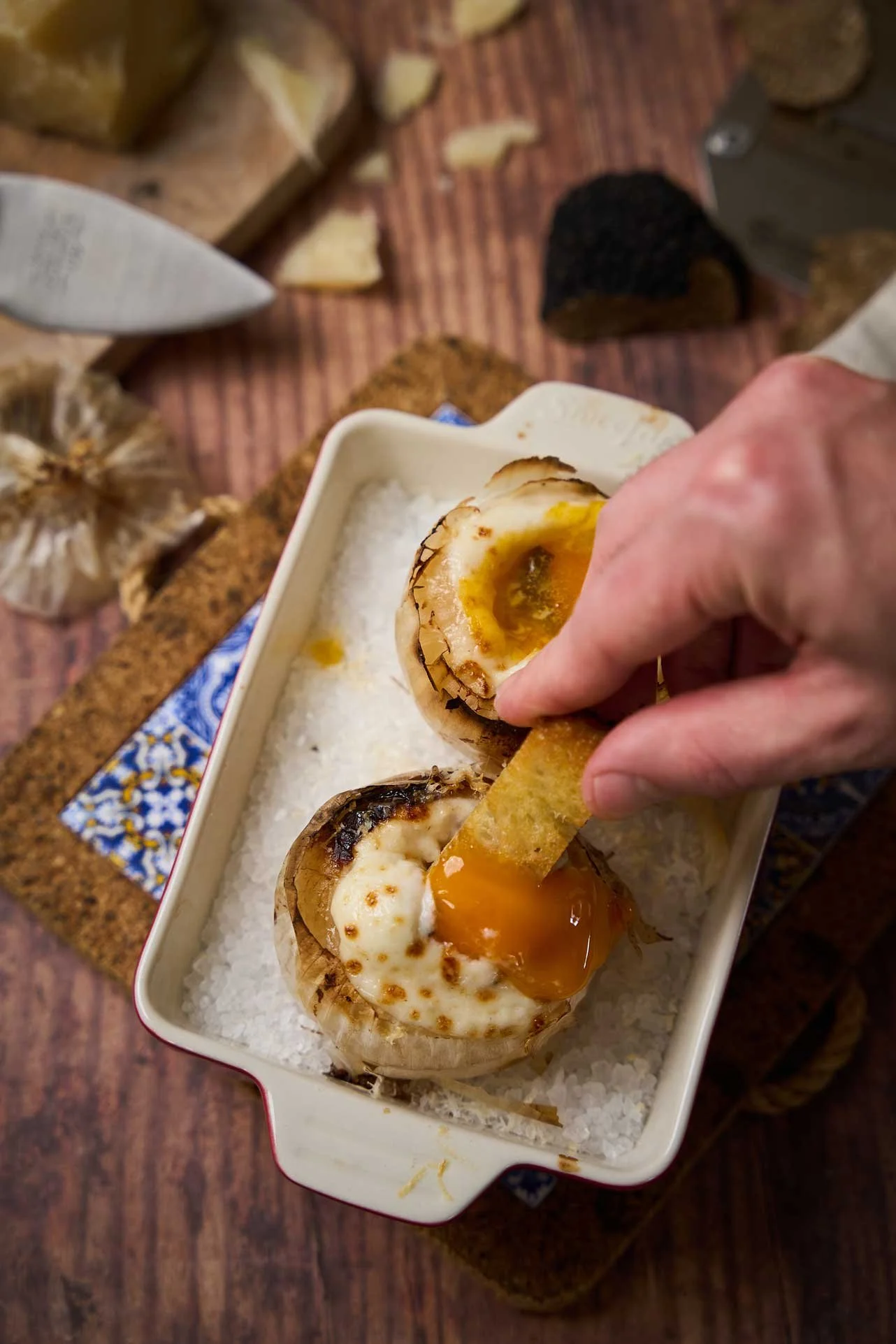 Now half fill the onion cavities with the onion soup, place 1 egg yolk gently in each of them, season with salt and top with a few fresh truffle shavings. Then cover with the Grana Padano bechamel and bake at 180°C for 5 minutes or until nicely golden on top.