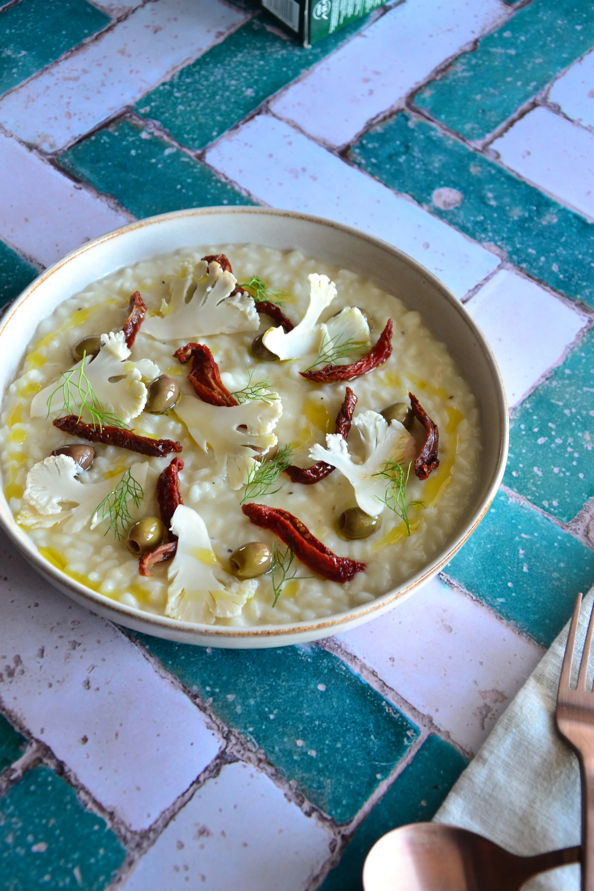 RISOTTO VEGANO AL CAVOLFIORE CON POMODORI SECCHI E OLIVE TAGGIASCHE